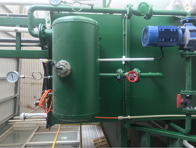 溶氣系統(tǒng)主要有溶氣罐、儲氣罐、空氣壓縮機、高壓泵組成,溶氣罐是系統(tǒng)中關鍵的部分,其作用就是實現(xiàn)和空氣的充分接觸,加速空氣溶解。